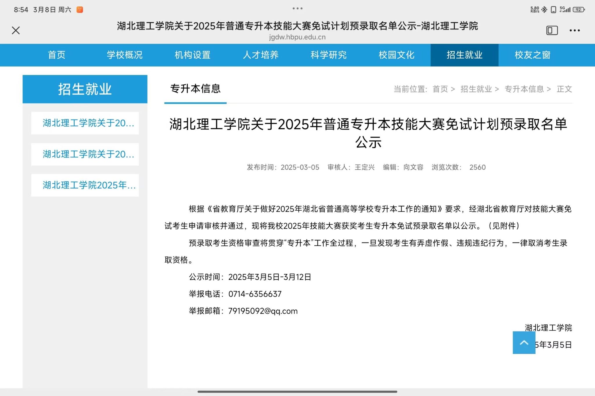 近日,湖北省教育厅公布2025年普通高等学校专升本免试录取名单,我校bat365在线中国官网登录入口沈志诚等6名学生因斩获湖北省职业院校学生技能大赛一等奖,全部获得免试专升本资格,同时被湖北理工学院录取。