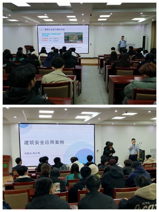 韩应博讲座的题目是《建筑安全应用案例》。他通过介绍海姆立克急救法并与现场同学互动,引入建筑安全主题;介绍了当前全国建筑施工行业安全生产的情况,强调安全生产对于社会的健康发展和稳定的重要性;讲解了建筑生产安全事故的类型,强调在施工建设中必须把安全生产放在首位;分享了降低安全事故发生频率的方法,强调应严格遵守有关安全生产的法律法规、技术规范、标准和规程。韩经理还为大家演示了建筑安全教育平台、建筑安全能力测评系统的使用方法。