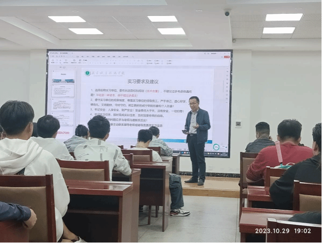 动员会上,还开展了职业生涯规划等相关专题教育。舒祖珍副教授从“青春与梦想”“诚信与礼仪”和“求职与面试”三个方面为建筑工程技术专业的同学们做了专题讲座。舒老师勉励同学们要以革命先烈为榜样,树立坚定的理想信念,勇担时代重任,珍惜岗位实习难得的机会,在实习中勤奋工作、积极创新、开拓进取。强调诚信的品质是做人的基石,倡导同学们在实习中要主动培养自己的综合素养。为同学们指出在求职和面试过程中会遇到和要注意的问题,提醒同学们要做好适应新时代要求的职业生涯规划和创业就业观。