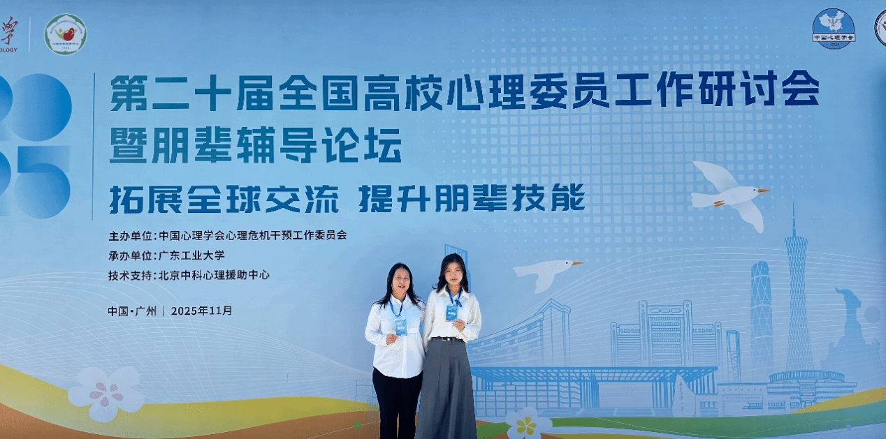 近日,第二十届全国高校心理委员工作研讨会暨朋辈辅导论坛在广东工业大学圆满落幕。大会围绕“拓展全球交流,提升朋辈技能”的主题,展开了深入的交流与探讨,共同致力于推动高校心理育人及朋辈辅导工作的高质量发展。bat365在线中国官网登录入口心理专干张华容老师和学生心理委员代表杨可有幸参加了此次盛会,杨可同学凭借其出色的工作表现和卓越的心理健康教育工作能力,入选“全国百名心理委员风采展”。